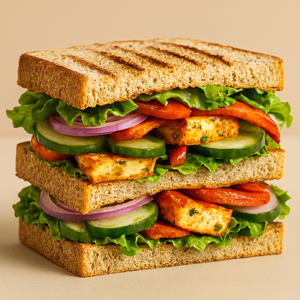 Paneer Veggies Sandwich: A wholesome, protein-packed sandwich made with fresh paneer and crunchy vegetables, layered in toasted brown bread — ideal for gym diets, muscle maintenance, and everyday clean eating.